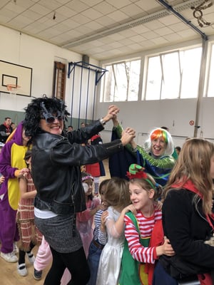 Welch ein Jubel! In Polonaise ging es nach Feiern und Tanzen im Hof in die Turnhalle. Dort konnten Fabelwesen, Polizist:innen, Sträflinge, Cowboys und Cowgirls, Harry Potters, Ketchup&Hotdog, Zauberer, Clowns, .... dann zur fantastischen Hexenmusik Party machen.