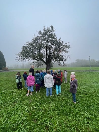 Die Klasse 1/2d erkundet neugierig die Streuobstwiese der Familie Wuggezer und erfährt dabei Spannendes über die darauf wachsenden Obstsorten und dort lebenden Tiere. Anschließend gab’s köstlichen Apfelsaft zur Stärkung.