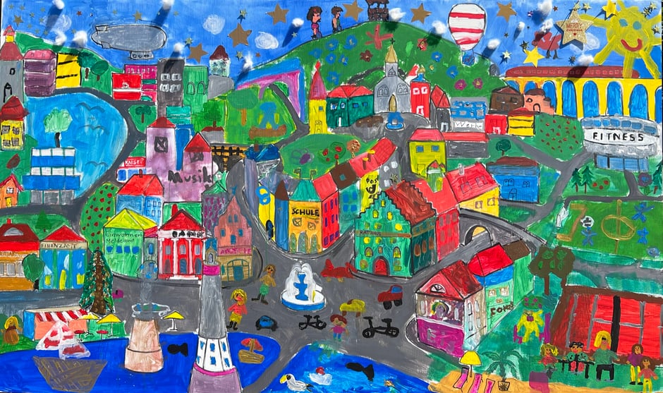 Ca. 50 Schüler:innen aus allen Klasse - also 1.-4. Klasse - haben immer in kleinen Gruppen von 3-5 Kindern mit viel Herzblut und Leidenschaft an dem Kunstwerk gemalt. Dargestellt wird „ihre“ Schulstadt Hoyerlingen, in der sie im Rahmen eines Projekts die letzten 3 Tage leben durften. Natürlich erkennen wir Teile von Lindau wieder durch den Leuchtturm und den Löwen, den Hoyerberg, das Rathaus etc. Weiterhin ist eine Vielzahl von Geschäften abgebildet, die ihre Schulstadt lebendig macht, wie eine Bank, die Schule, der Kindergarten und sogar das Finanzamt und das Arbeitsamt.